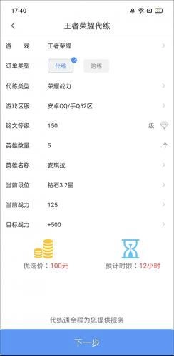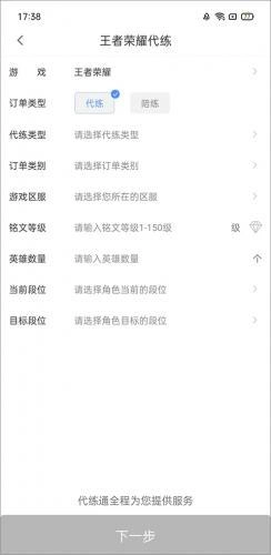 2、输入订单的信息内容,在这里输入代练类型、游戏区服、铭文等级、英雄数量、当前段位等。