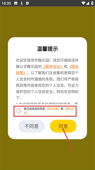 进入【学趣乐园】的温馨提示页面后,请先勾选【我已经阅读并同意《隐私政策》和《服务协议》】这一选项,随后点击黄色的【同意】按钮即可。