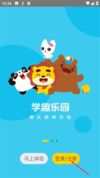 在【学趣乐园】的启动界面,底部设有【登录/注册】按钮,点击此按钮即可进入登录相关操作界面。