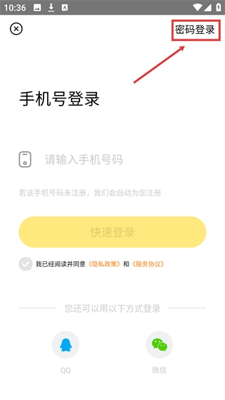 当处于【手机号登录】界面时,点击界面右上角的【密码登录】选项,即可切换至密码登录的操作界面,此外还支持其他登录方式。