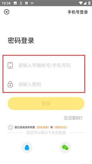 在【密码登录】页面,按顺序填写【学趣帐号/手机号码】和【密码】,核对信息无误后点击【登录】按钮,就能完成登录步骤。