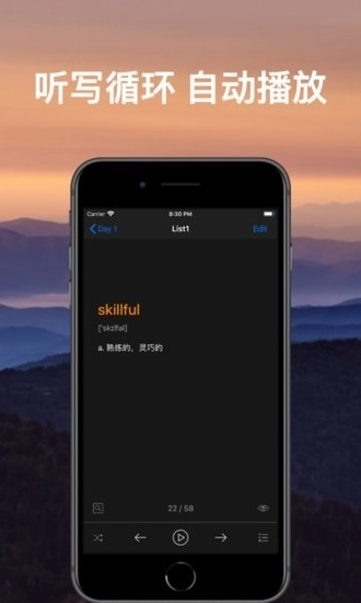 * 「听写模式」:支持重复、间隔、循环与自动功能,提供全屏显示模式,且音频可在后台播放;