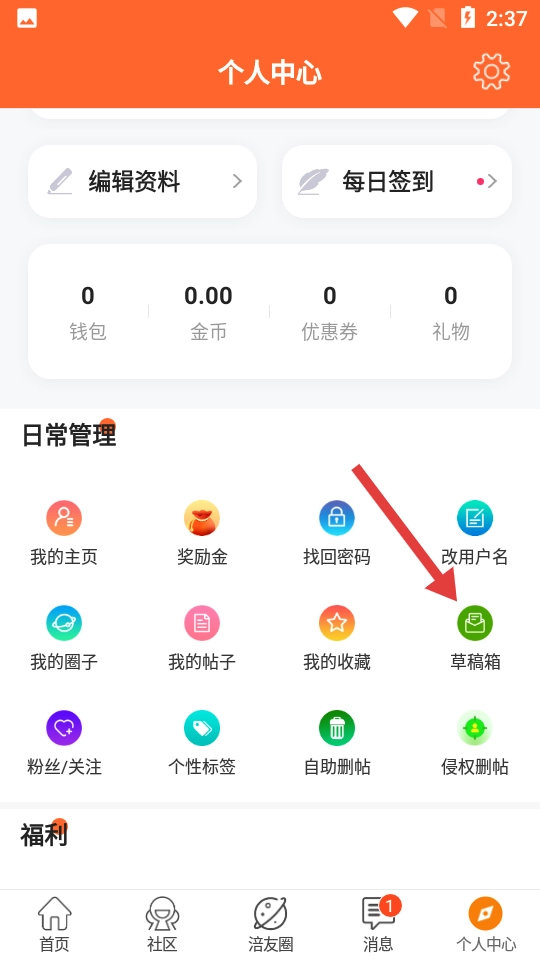 在日常管理板块,点击【草稿箱】,进入草稿箱页面。