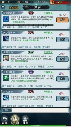 点击武学按钮就能学习各式各样的招式,而每一种招式都得先收集对应的功法才能进行学习。