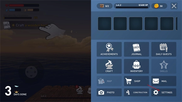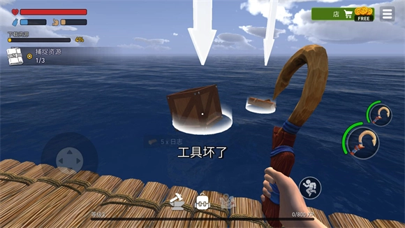 采集材料有两种途径,一种是徒手采集,这种方式仅能获取木筏周边的资源,另一种则是借助木钩来收集周围漂流的物资。