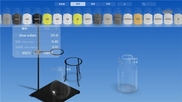 器皿摆放完毕后,接下来就可以点击“水滴”图标来挑选各类化学原料了。这款软件包含了化合物、固体颗粒、液体以及气体这四大类原料,每当选择对应的化学原料时,系统便会展示出与之相关的化学元素信息。