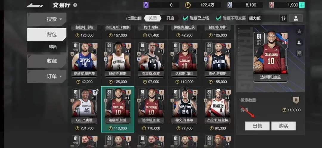 ④背包上方设有批量出售功能,可选中多个不同球员一并上架出售,从而提升操作效率
