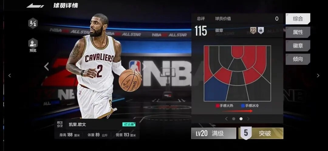 在球员详情的综合页面里,能清晰看到当前球员在三分、中投、突破、篮板等方面的偏向数值,向右滑动还能查看该球员的投篮热区与冷区。