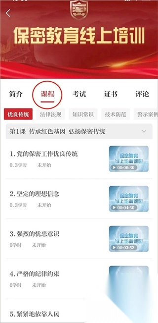 进入培训界面后,点击“课程”即可开启学习之旅。课程涵盖保密优良传统、保密法律法规、保密知识常识、保密技术防范与保密警示案例五个板块,呈现形式包括视频与音频。需要注意的是,标注有“必修”字样的课程为必学内容。