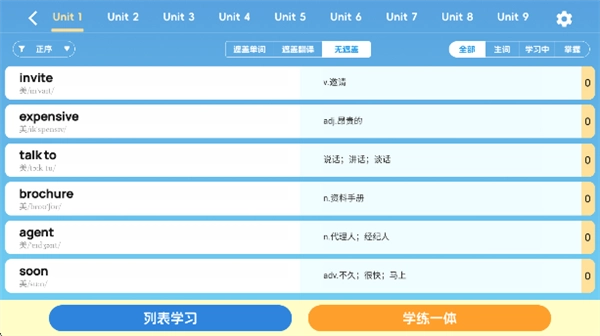 点击学单词就可以查看到各个单元的单词了
