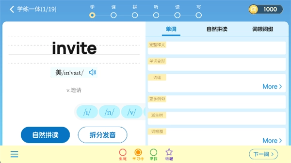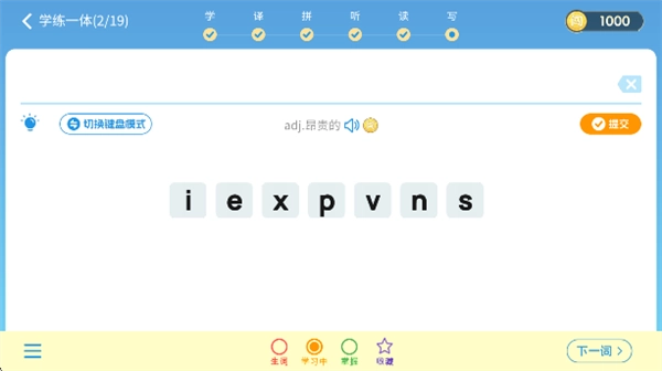 拼写模式:按字母逐个拼出完整单词,难度循序渐进,记忆更牢固。