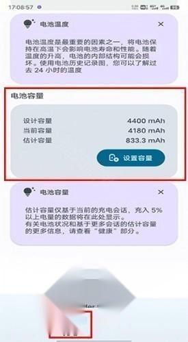 你可以先找到页面最下方的“充电”选项并点击进入,进入后就能看到电池容量相关信息,从中可以查看电池的出厂容量以及预估容量(也就是电池寿命)。