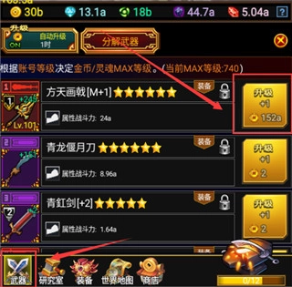 点击左上角的自动升级选项,就能选择武器并开启自动强化功能。
