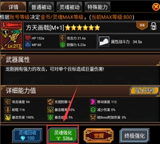 灵魂强化与金币强化的机制类似,在提高武器基础技能数值的同时,还能依据强化等级解锁灵魂被动技能。灵魂被动技能共有九个,每达成100级灵魂强化,就能解锁其中一个。并且,随着技能等级的不断提高,灵魂强化所需消耗的灵魂数量也会逐步增加。