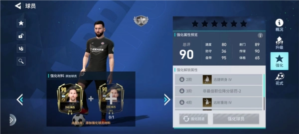 添加球员材料能够对球员进行强化,强化后球员的总评数值会增加1,强化效果可以在强化属性预览界面查看。