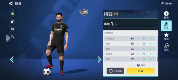 球员等级提升时,所需消耗的经验卡数量会逐次增加,并且每提升一级,球员的能力值都会得到一定幅度的增长。例如:当球员等级从1级提升到2级时,他的凌空抽射、抢断、盘带、任意球、强壮以及射术这六项数值都会各增加1点。