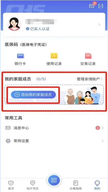 在【我的家庭成员】板块中点击【添加我的家庭成员】选项,随后按照系统给出的操作提示,完成家人与家庭成员身份的绑定流程。