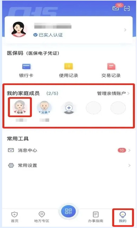 绑定成功后,回到首页,点击【我的】选项,再进入【我的家庭成员】板块,点击对应的家庭成员头像,就能获取该家人的医保电子凭证了!