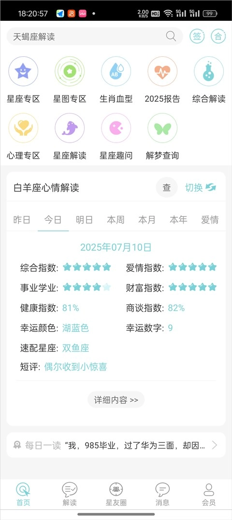 正版内容,助力网友知晓十二星座每日、每周及每月的运势变动情况,还提供每日运势的综合剖析。