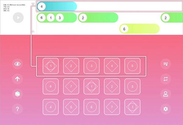 点击歌曲标题后稍作等待,乐谱就会加载到练习界面,乐谱共分为三行,其中第一行与键盘的第一行按钮相对应。