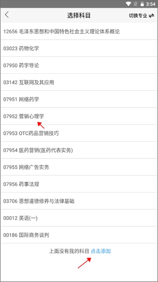 点击其中一个专业之后,页面又跳转到科目选择,你需要选择你要练习的科目,如果没有你的科目可以点击下方的“添加”按钮。