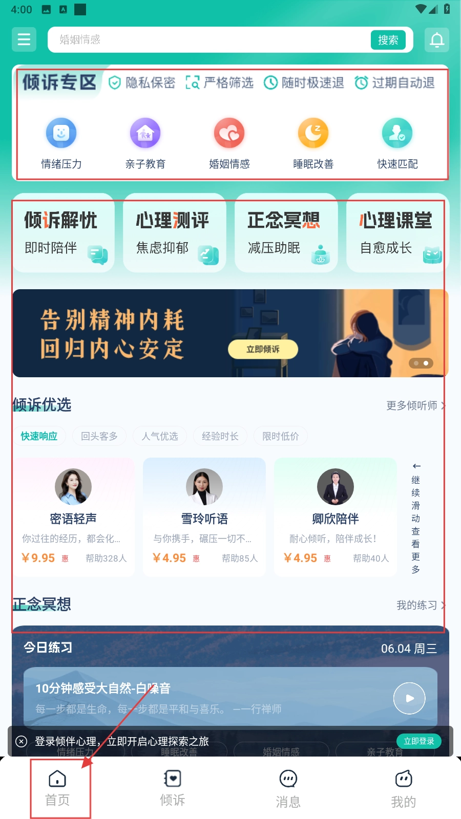打开应用后,在首页找到并点击倾诉专区,即可进入心理服务的选择操作环节。