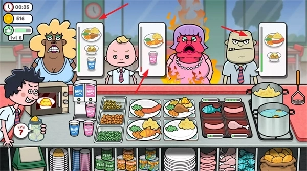 在界面下方挑选合适的食物,直接递交给对应的客人,操作一定要在客人耐心耗尽之前完成。