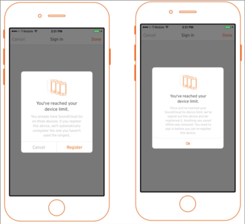 你一次最多可在3台设备上订阅SoundCloudGo(该限制不包含在桌面端使用SoundCloudGo的情况)。若你想登录第四台设备,我们会请你确认是否要登录该设备,此时你最旧的登录会话将被自动注销,且该设备上用于离线收听的曲目或播放列表会被删除。当你登录第四台设备时,会收到通知提醒你对“旧”设备所做的更改。另外,你在30天内最多可登录10台设备。同时,你的Go/Go+订阅同一时间仅能在一台设备上收听。若你尝试在多台设备上同时使用订阅,会收到“暂停,因为你开始在另一台设备上播放”的提示消息。