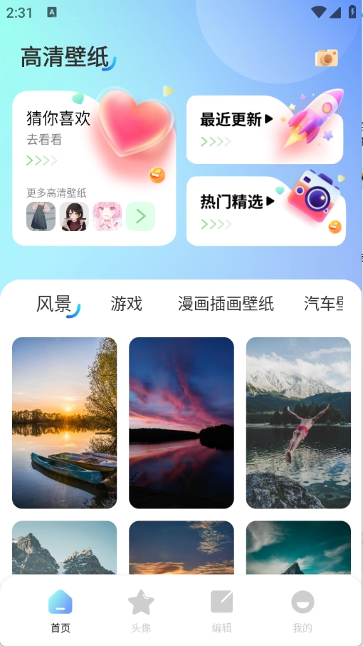 首页页面汇聚了大量壁纸资源,涵盖风景、游戏、汽车等类别。