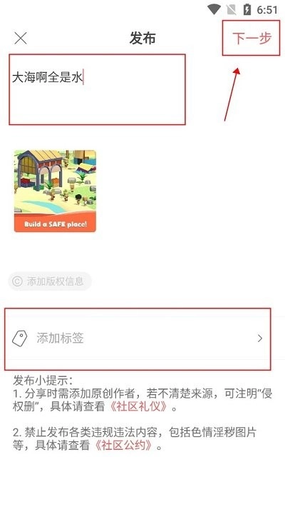 4、进入到发布界面,可以在空白栏输入文字内容,中间部位还能添加标签,文字内容输入完后,点击右上角的下一步继续完成发布