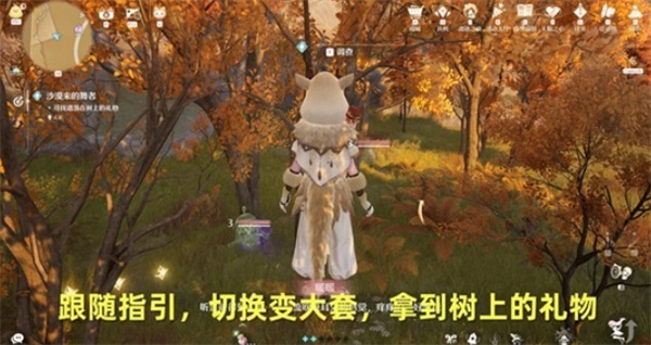 3、按指引找到遗落在树上的礼物,切换变大套装,拾取树上物品,将礼物交给纱之公主