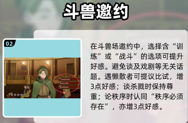 当邀约发生在斗兽场时,应重点关注含有“训练”或“战斗”关键词的对话选项,并避免偏离主题的内容。此外,若他邀请你一同观看戏剧,且对舞台上表现懒散的角色表示不满,此时建议回应让他亲自上台比试,此举可带来3点好感提升。若对话中涉及杀戮议题,选择表达尊重的态度更为合适;而当他谈及秩序维护之艰难并感叹坚守者稀少时,回应“秩序必须存在”同样可获得3点好感加成。