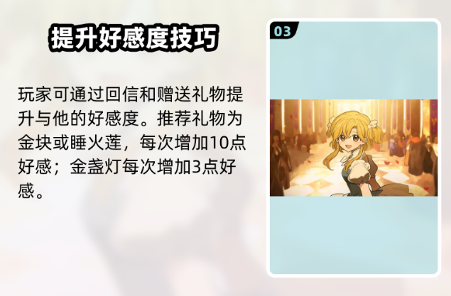 除了对话选择外,还有多种途径可以增进与泽的关系。定期查看邮箱,你会收到他寄来的信件,及时回信能够稳定提升好感。同时,赠送礼物也是不可忽视的方式。推荐携带金块或睡火莲,每次赠送可增加10点好感;金盏灯同样是不错的选择,虽仅增加3点好感,但易于获取,适合日常维系关系使用。