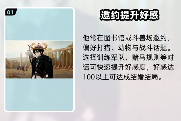 泽通常会在两个主要地点发起邀约:图书馆与斗兽场。想要高效提升好感,关键在于理解他的兴趣倾向——狩猎、动物以及战斗相关内容是他最关注的话题。在对话过程中,优先选择涉及这些主题的选项,能显著加快好感积累速度。若目标是解锁结婚结局,则必须确保好感度达到100以上。例如,在图书馆场景中,讨论军队训练方式或了解赌马规则等话题,均可有效增加好感值。