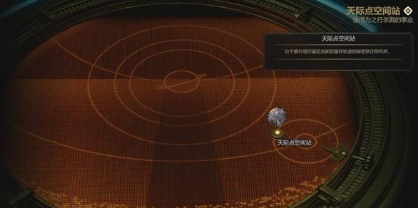 对话结束后我们跟着目标点回到游戏刚开始的地方,和面前的机器互动,选择“天际点空间站”传送过去。这是我们去的第一个星球。