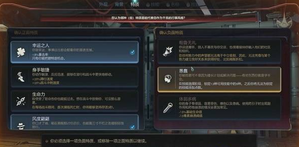 正面特质最多可以选择两个,不过选择两个正面特质的话必须要选择一个负面特质,不想选负面特质的话可以就选择一个正面特质。