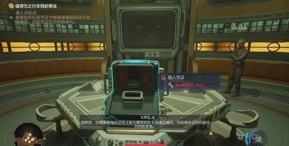 我们跟着目标点走,先来到下方的机器处,和机器互动可以接取到主线任务值得为之行杀戮的事业。此时我们没有获得凭证,并不能启动。