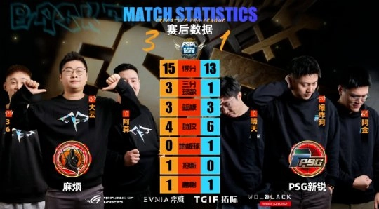 败者组比赛中麻烦遇到了PSG新锐的挑战,第一局比赛1分险胜对手,第二局比赛PSG新锐战队3分命中率堪忧,麻烦战队取得了赛点,第3局比赛PSG新锐1分险胜扳回一城,第4局比赛麻烦顶住压力,总比分3比1战胜对手,PSG新锐无奈出局。