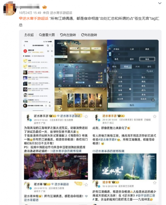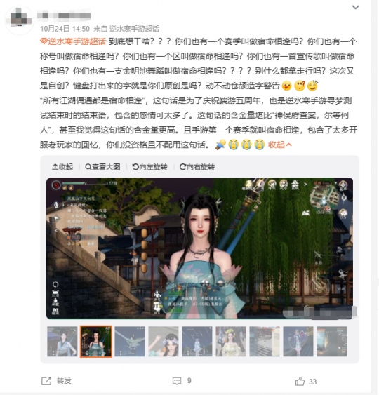“所有江湖偶遇,都是宿命相逢。”这句话不仅仅是《逆水寒》手游的Slogan,还包含了玩家们太多的感情回忆。以至某游戏在近日公然使用擦边关键词后,遭到无数逆水寒玩家的自发声讨。他们有的张贴证据,有的予以声援,只为守护好那份宿命相逢的最初信仰。由此不难看出,宿命相逢其实是大家心目中的白月光,是不容亵渎的信仰。