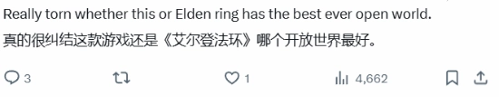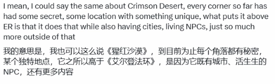 该玩家随后补充道,《红色沙漠》的每一处角落都藏有秘密与独特内容,其优势在于不仅做到了高探索密度,还拥有鲜活的城市与NPC生态,这是《艾尔登法环》等作品所不具备的。也有玩家表示,仅游玩10小时就被游戏的惊奇感深深吸引,同时也有玩家纠结其与《艾尔登法环》谁才是开放世界天花板。